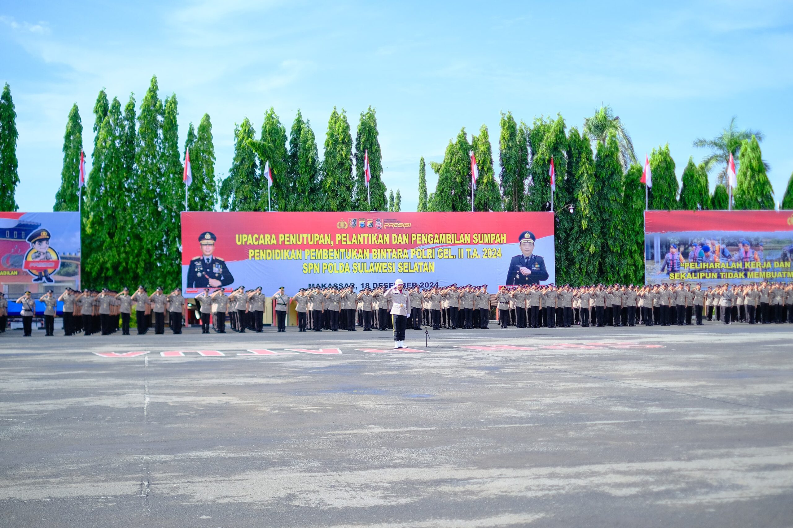 Kapolda Sulawesi Selatan, Irjen Pol. Yudhiawan, S.H., S.I.K., M.H., M.Si., memimpin langsung Upacara Penutupan Pendidikan Pembentukan Bintara Polri Gelombang II Tahun Anggaran 2024 yang berlangsung di Lapangan Upacara SPN Polda Sulsel pada Rabu (18/12/24).