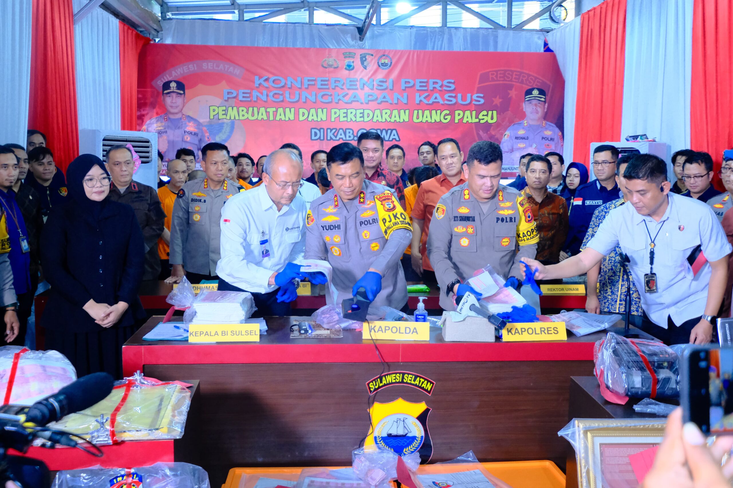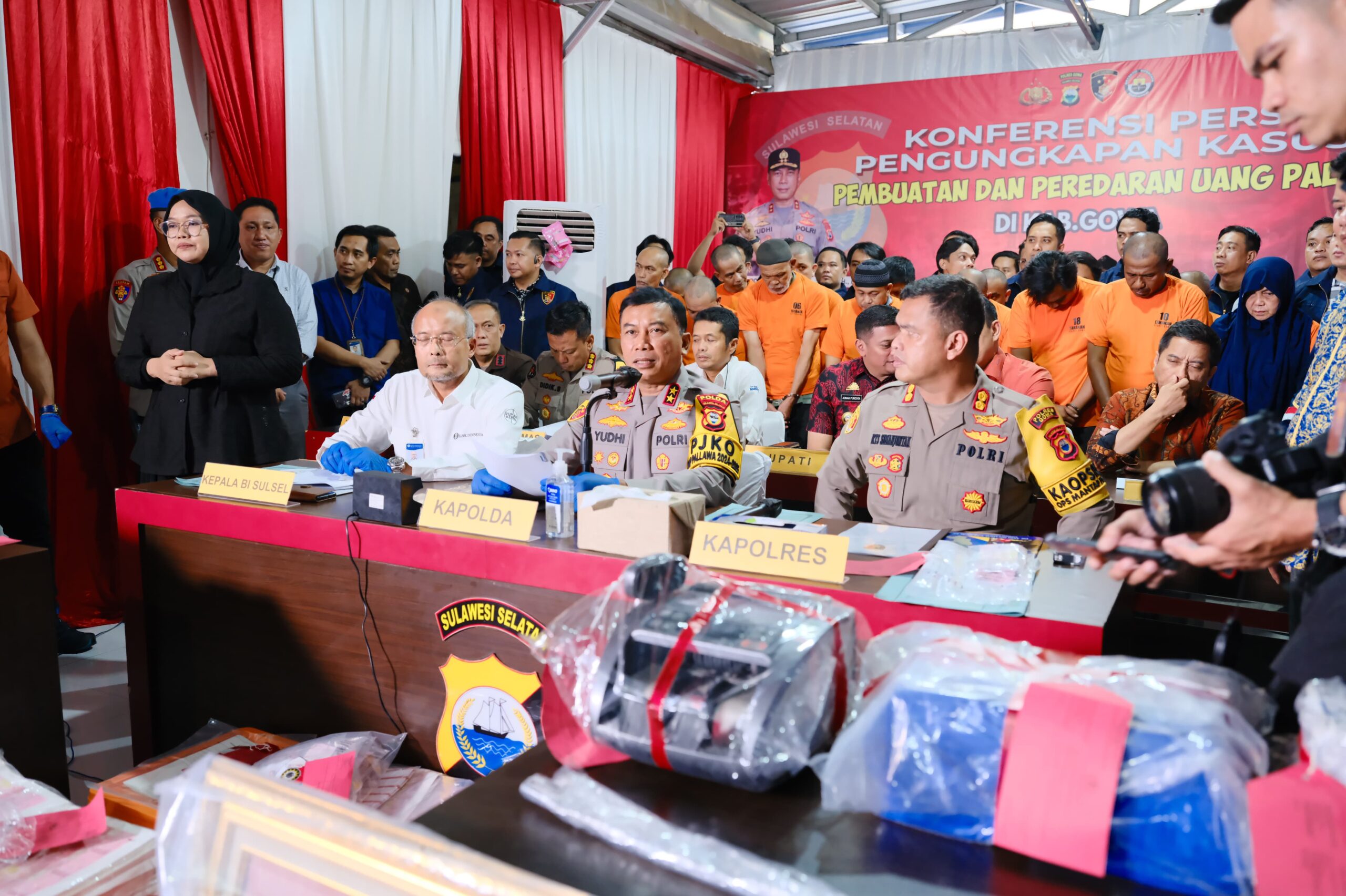Kepala Kepolisian Daerah (Kapolda) Sulawesi Selatan, Irjen Pol. Yudhiawan, memimpin langsung Press Release terkait pengungkapan kasus pembuatan dan peredaran uang palsu yang terjadi di Kabupaten Gowa. Kegiatan tersebut digelar di Mapolres Gowa pada Kamis, (19/12/2024).