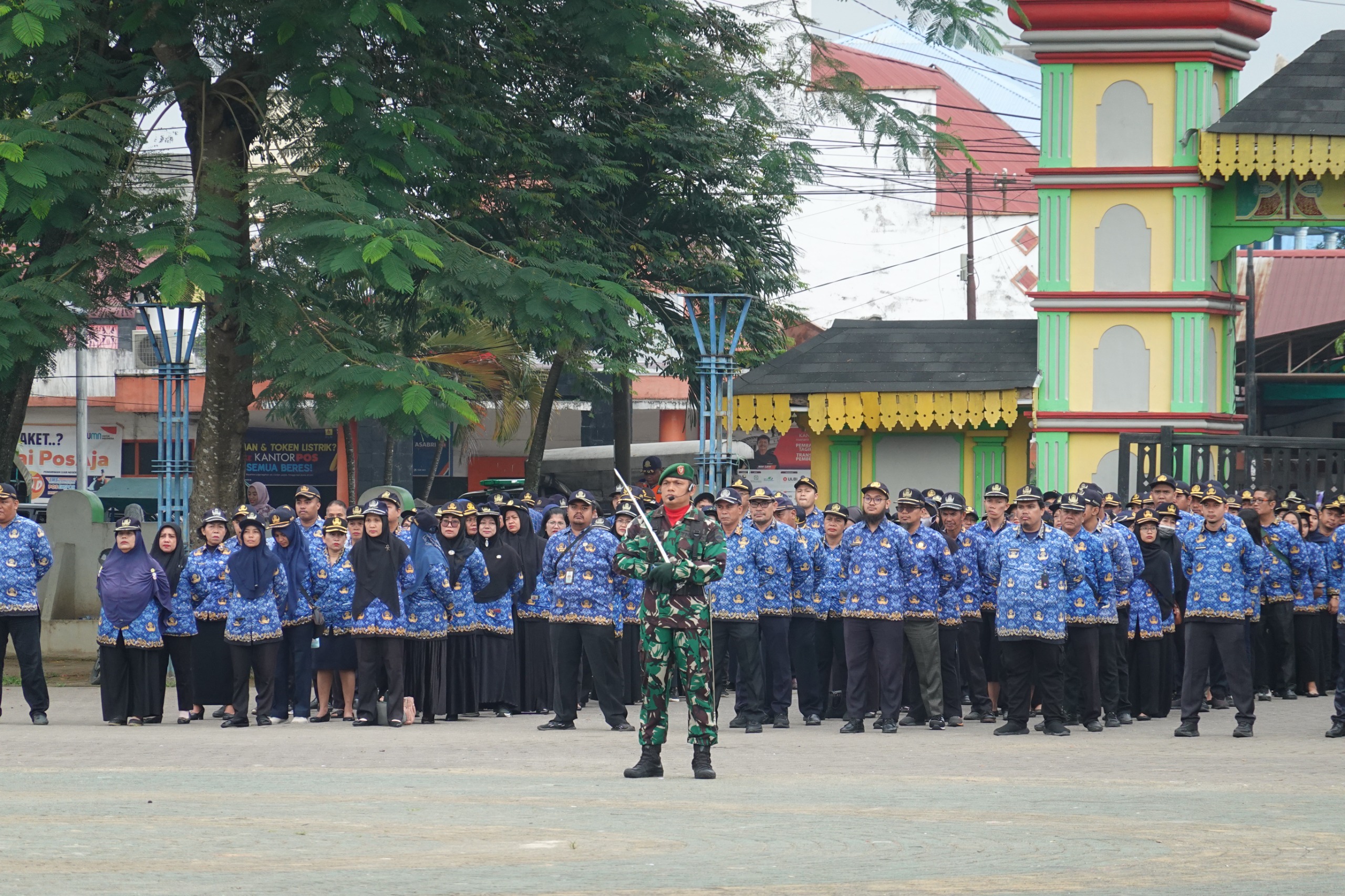 Penjabat (Pj.) Wali Kota Tebing Tinggi Dr. Moettaqien Hasrimi, S.STP., M.Si. yang dalam kesempatan ini diwakilkan oleh Asisten Administrasi Pemerintahan dan Kesejahteraan Rakyat (Aspem dan Kesra) Drs. Bambang Sudaropno, bertindak selaku Inspektur Upacara.