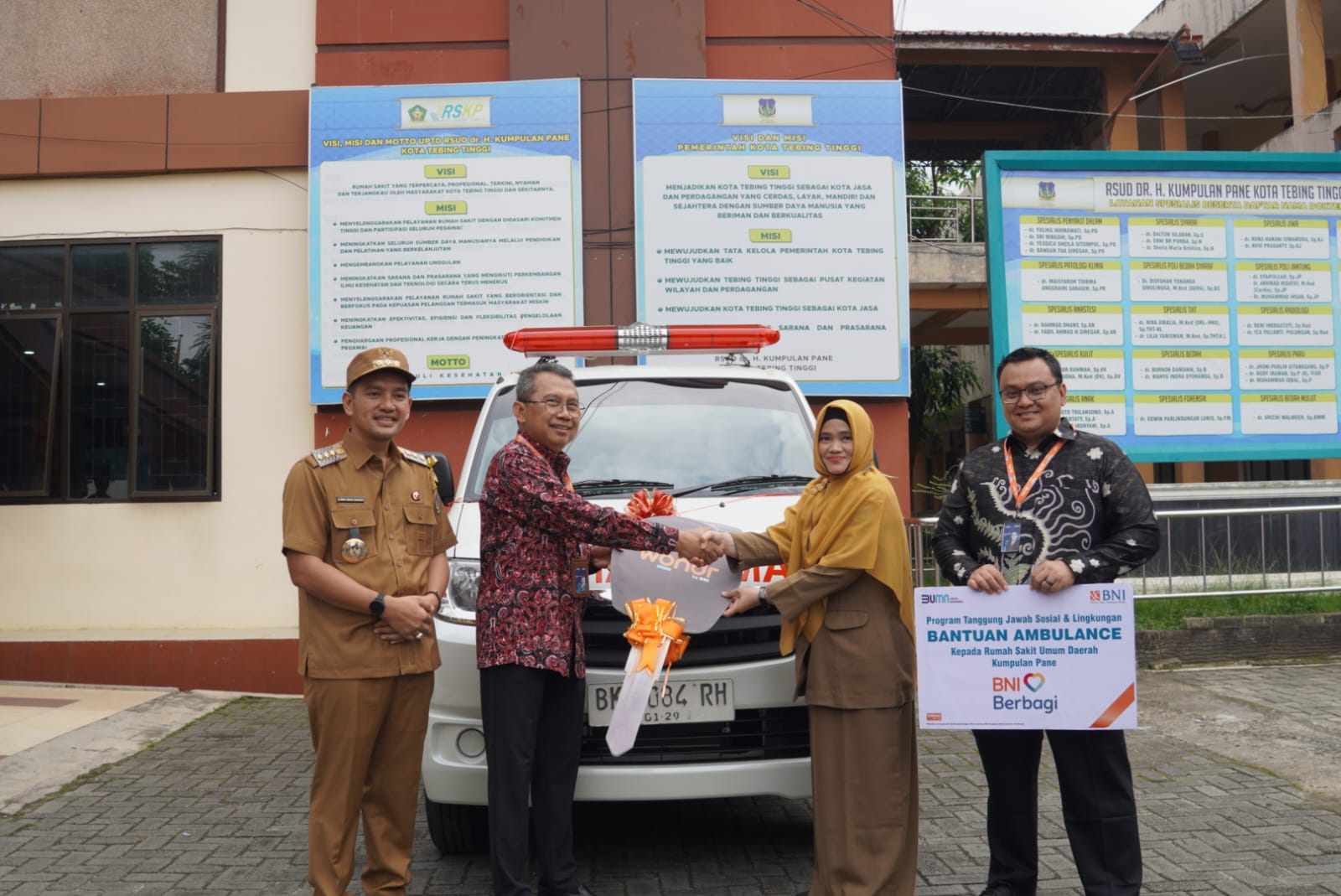 Rumah Sakit Umum Daerah (RSUD) dr. H. Kumpulan Pane menerima bantuan satu unit mobil ambulans dari Bank Negara Indonesia (BNI) Kantor Cabang Tebing Tinggi. Bantuan ini diserahkan setelah apel yang dipimpin oleh Wali Kota Tebing Tinggi, H. Iman Irdian Saragih, di halaman RSUD Kumpulan Pane, Senin (14/4/2025).