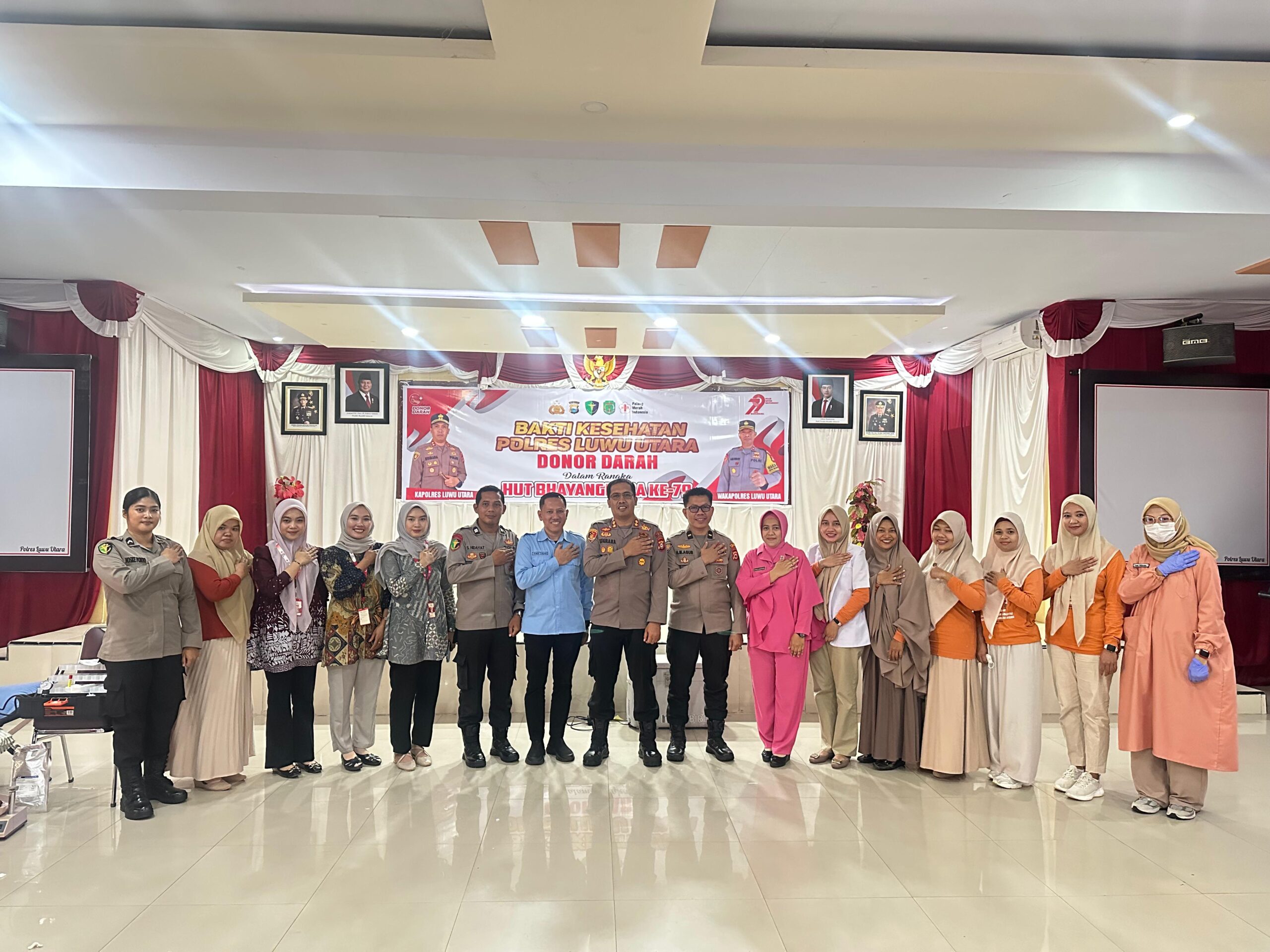 Masamba – Dalam rangka menyambut Hari Bhayangkara ke-79 tahun 2025 yang mengusung tema “Polri untuk Masyarakat”, Polres Luwu Utara menggelar kegiatan bakti kesehatan donor darah yang diikuti oleh personel kepolisian dan masyarakat. Kegiatan kemanusiaan ini digelar di Aula Sarja Arya Racana Mapolres Luwu Utara sebagai wujud nyata kepedulian Polri terhadap sesama.