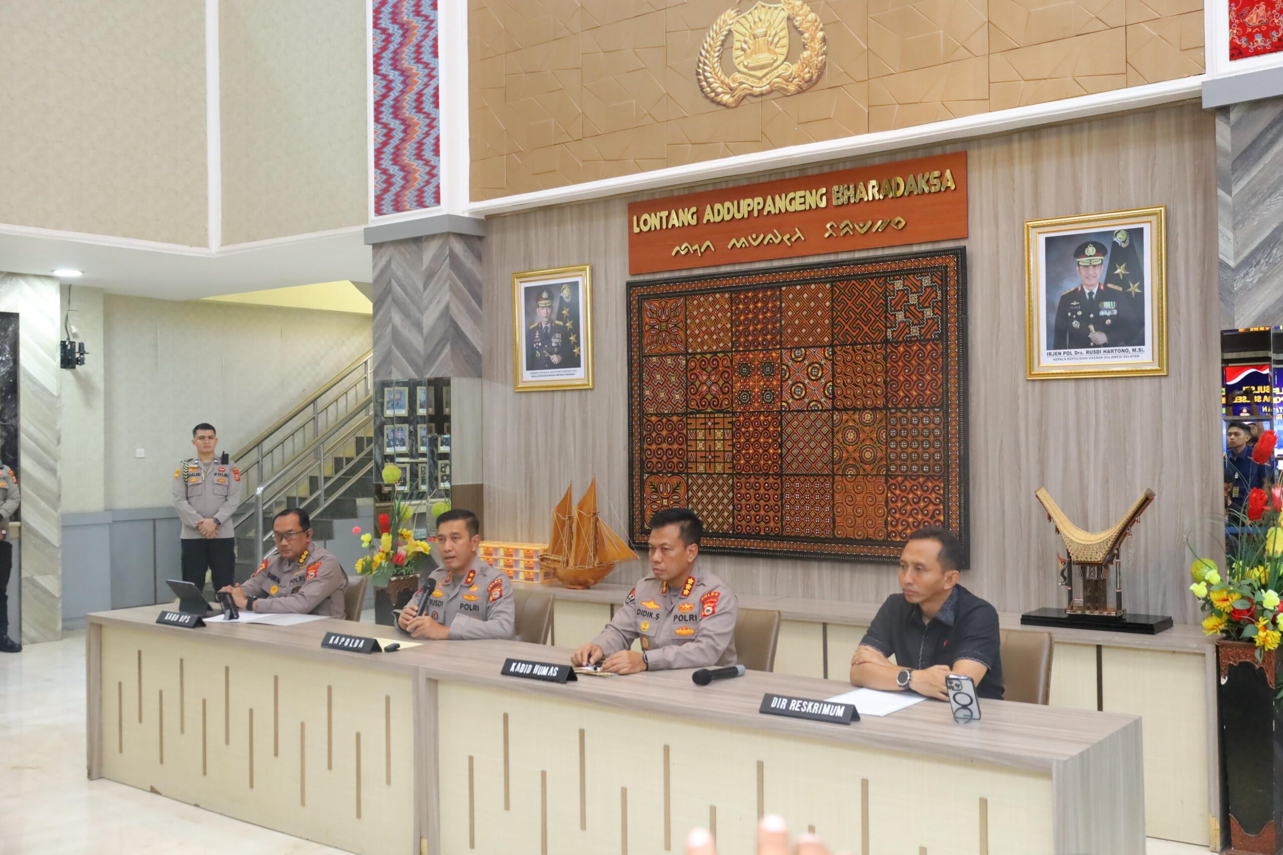 Kapolda Sulawesi Selatan Irjen Pol. Drs. Rusdi Hartono, M.Si., memimpin langsung press conference terkait perkembangan situasi keamanan dan ketertiban masyarakat (kamtibmas) di wilayah hukum Polda Sulsel, pasca satu tahun pemerintahan Presiden Prabowo Subianto dan Wakil Presiden Gibran Rakabuming Raka.
