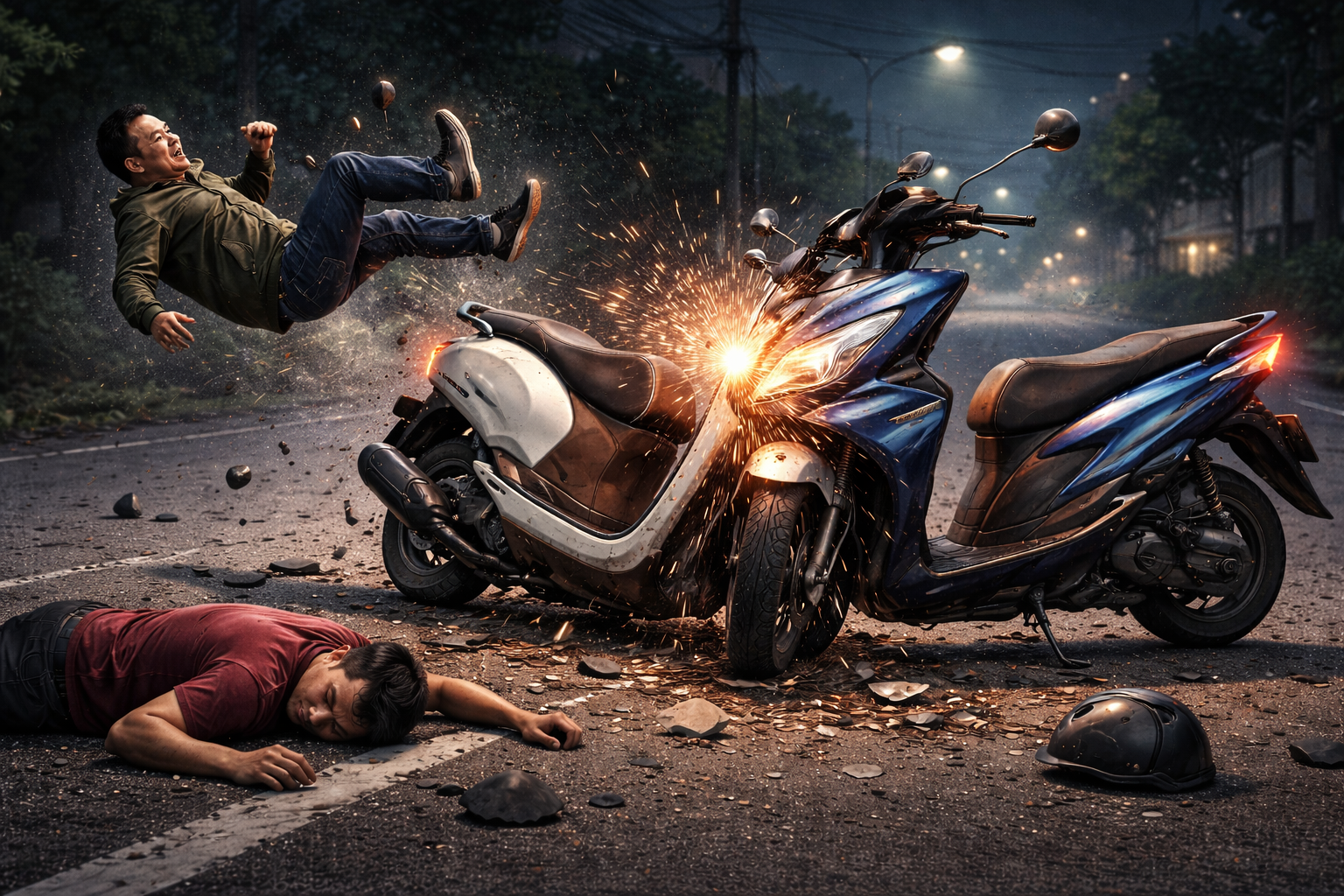 Akibat insiden tersebut, pengendara Scoopy mengalami luka lecet di lutut, serta nyeri di dada akibat benturan setang. Sementara pengendara Beat mengalami patah tulang di bagian kiri tubuh. Dua kendaraan juga mengalami kerusakan cukup parah.