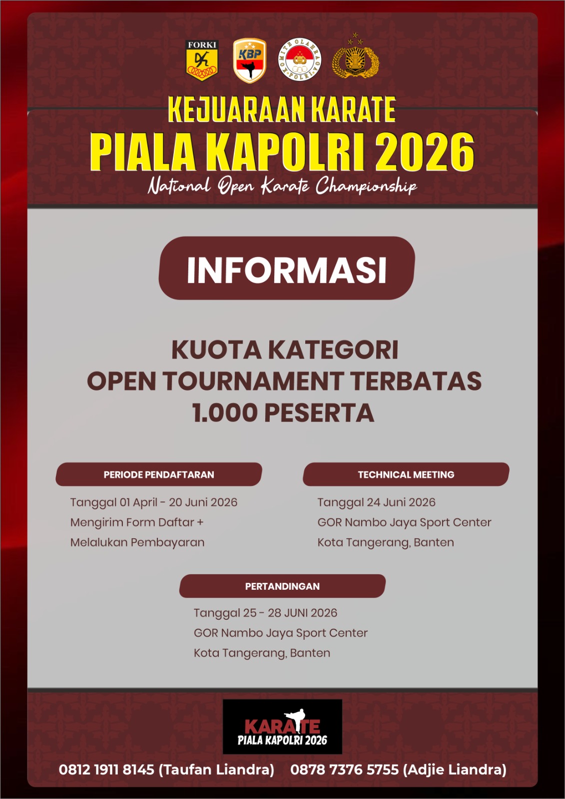 TANGERANG — Kejuaraan bergengsi Karate Piala Kapolri 2026 siap digelar dan menjadi ajang unjuk kemampuan para atlet dari seluruh penjuru Tanah Air.